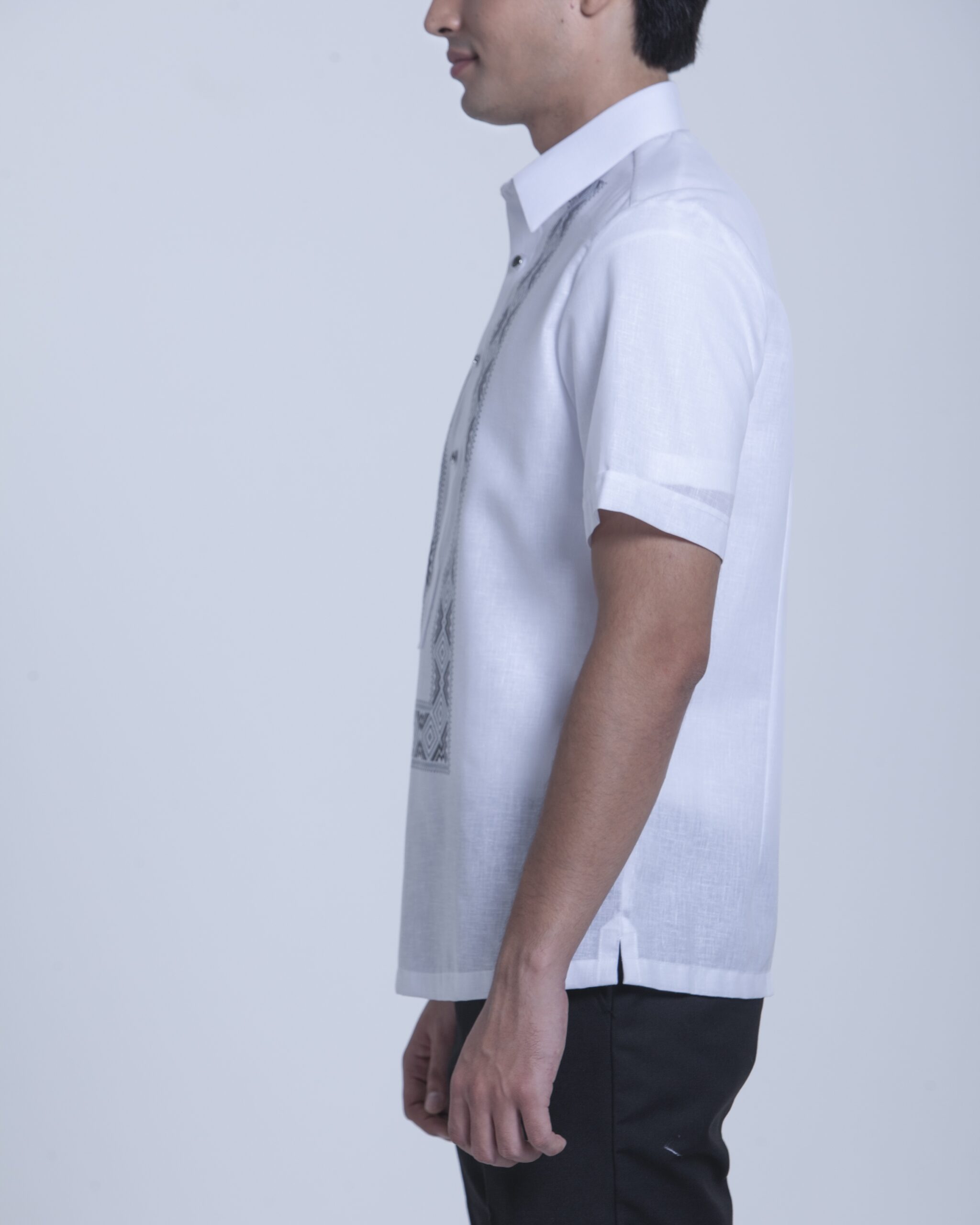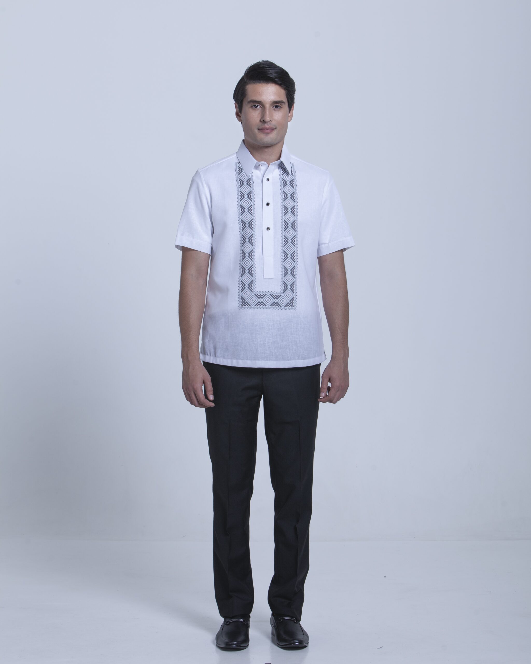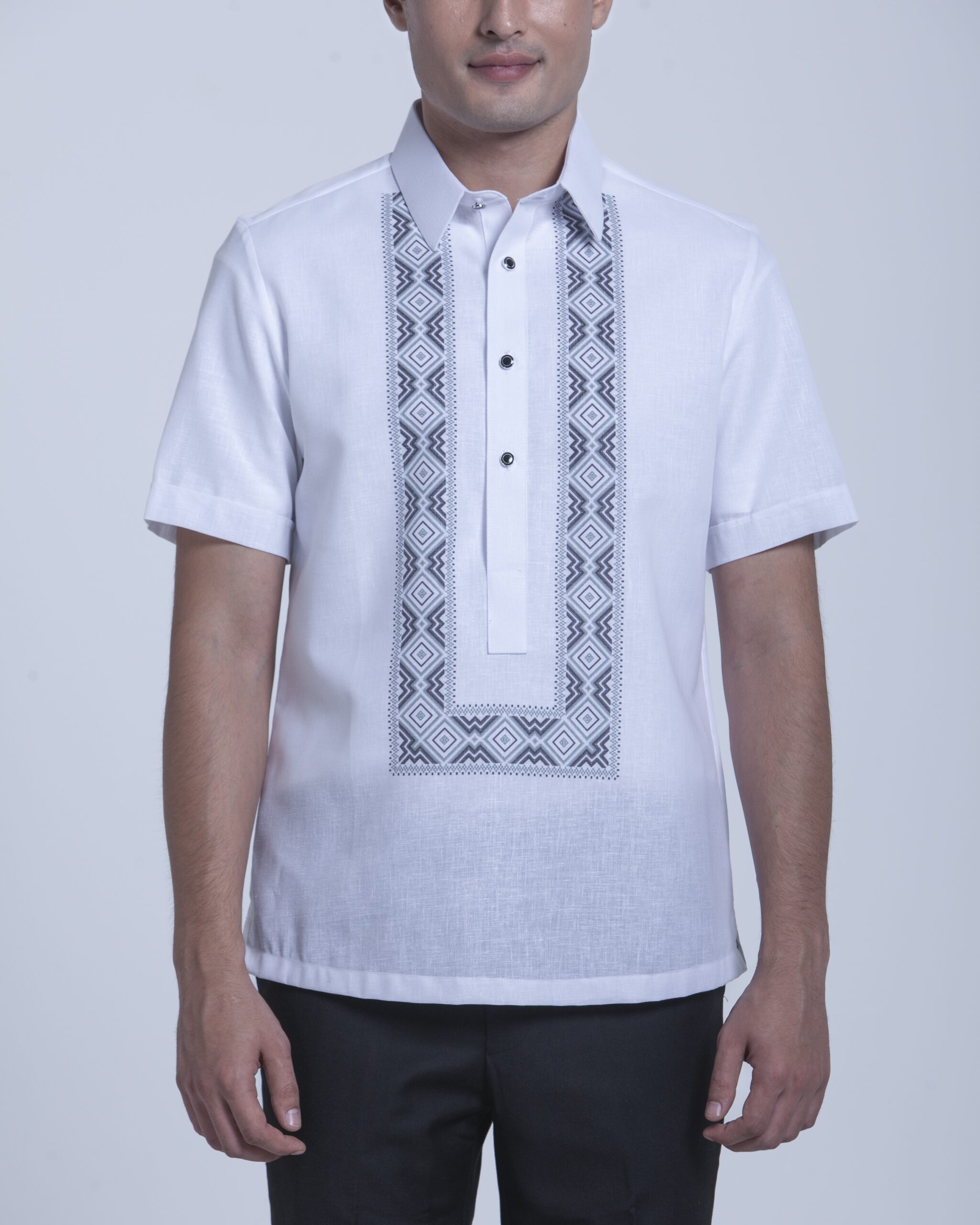 This modern Onesimus half-open Office Barong has ethnic print complemented with special buttons.