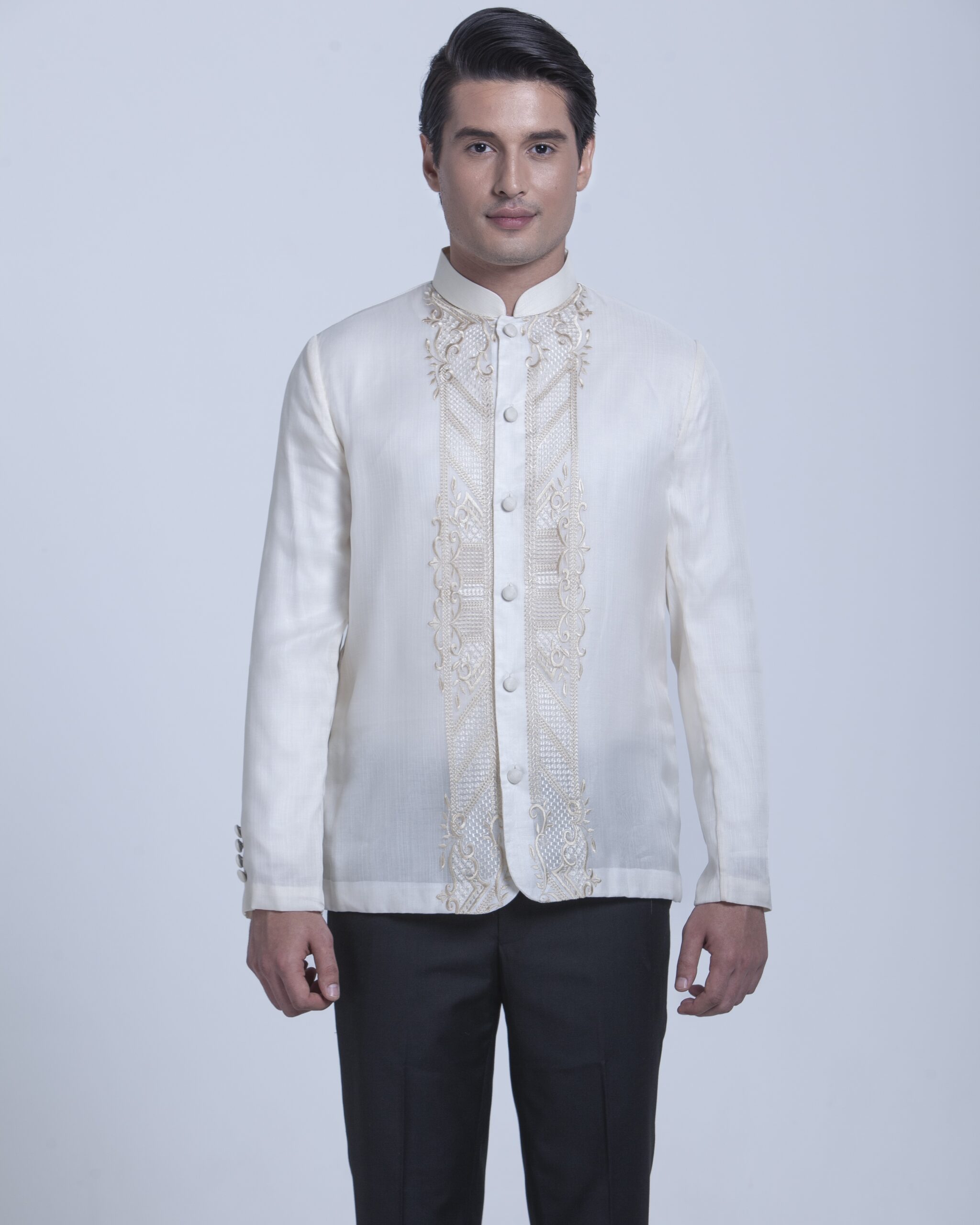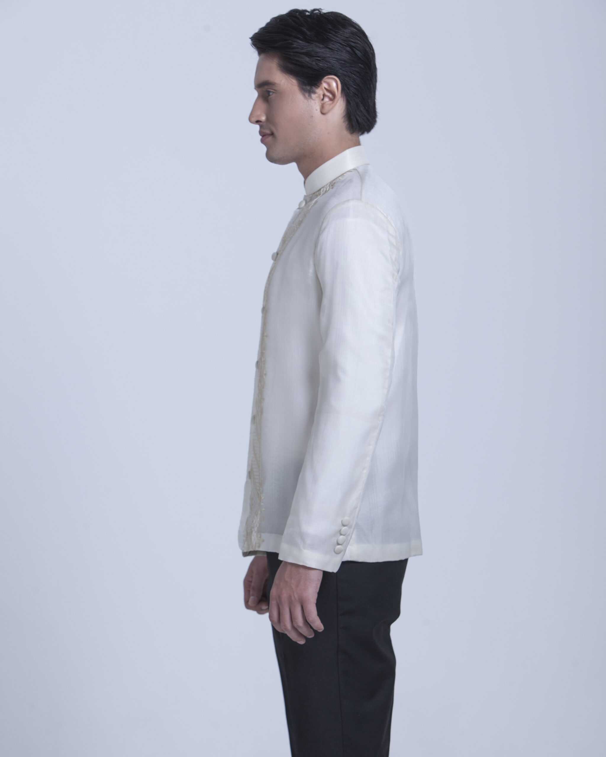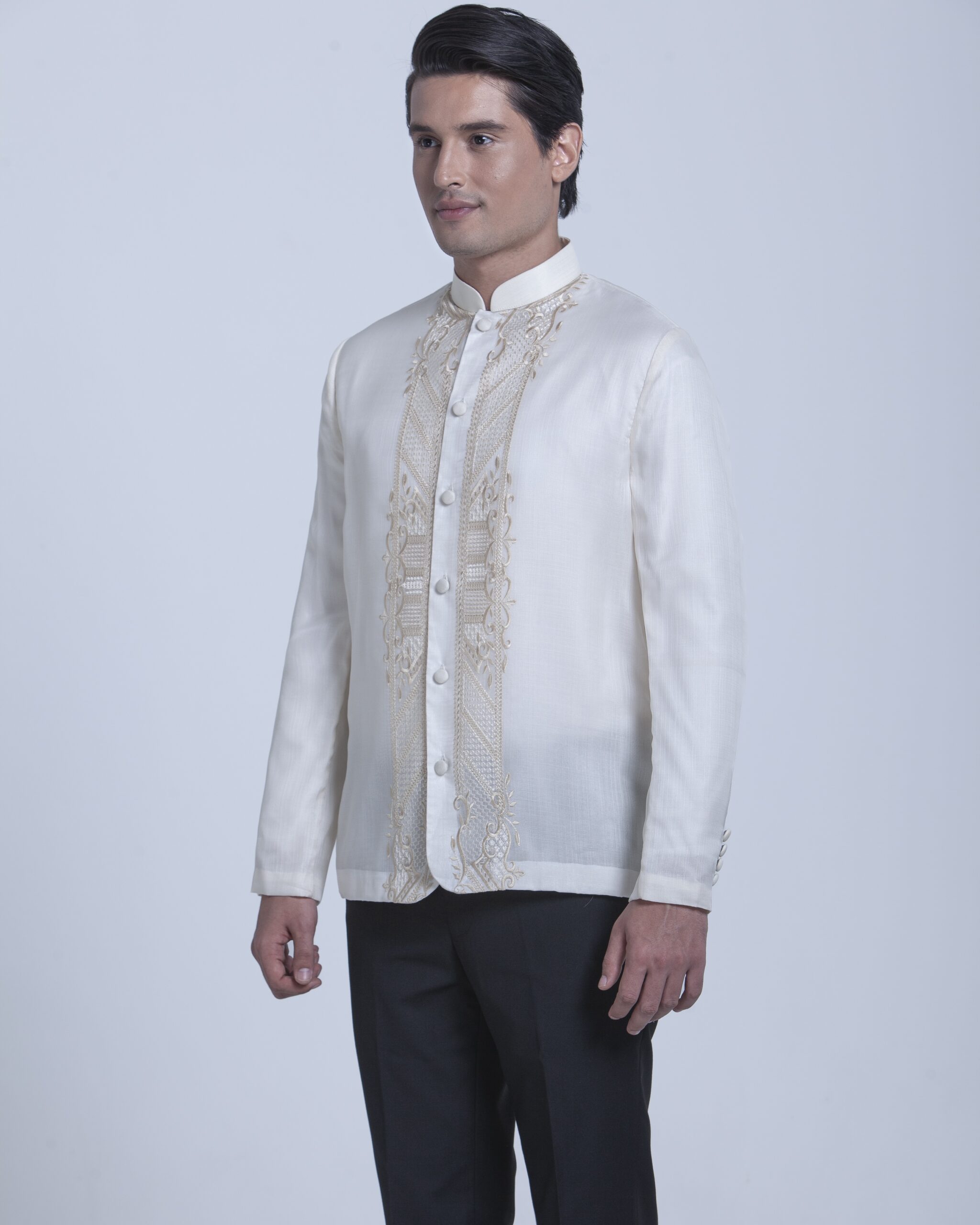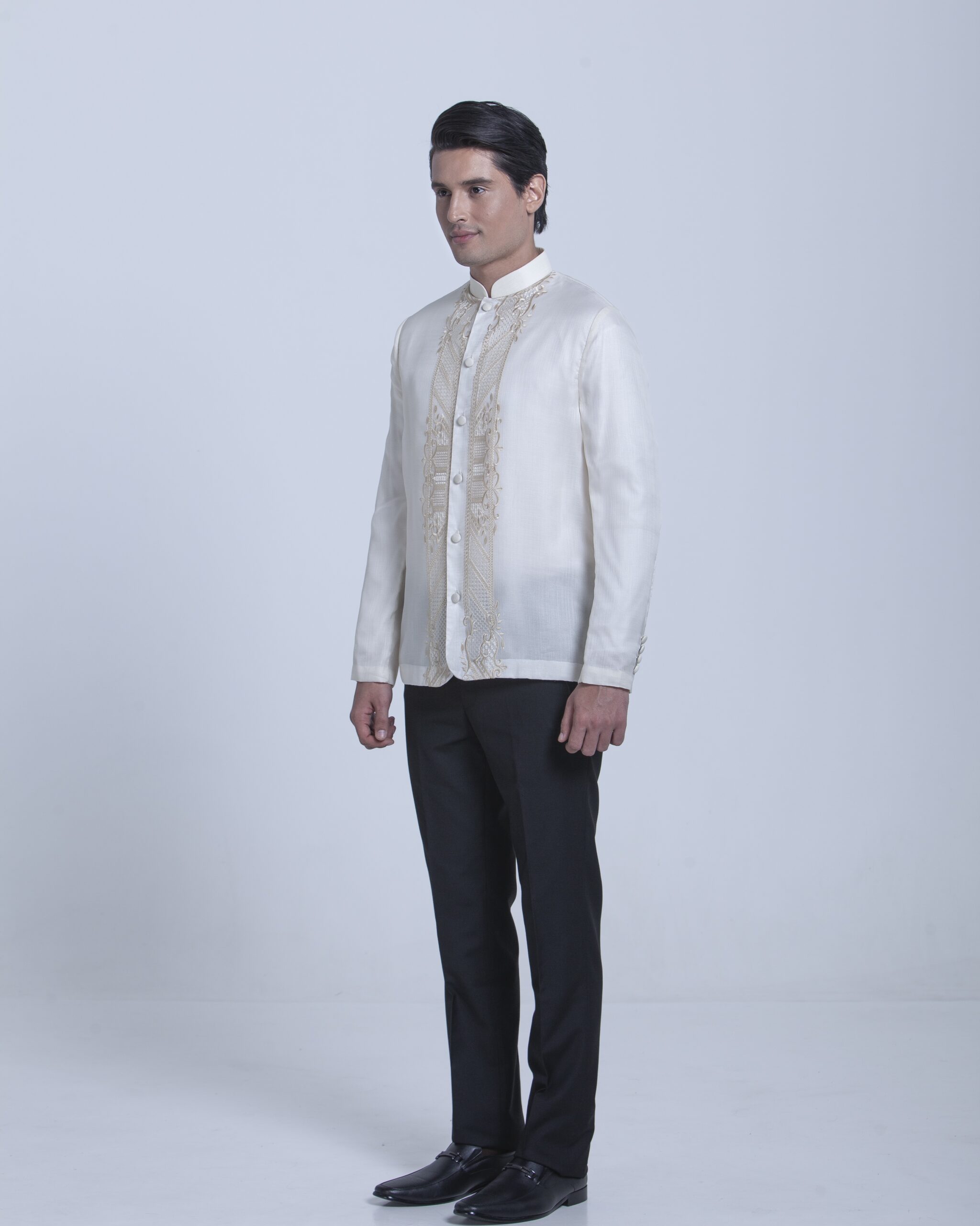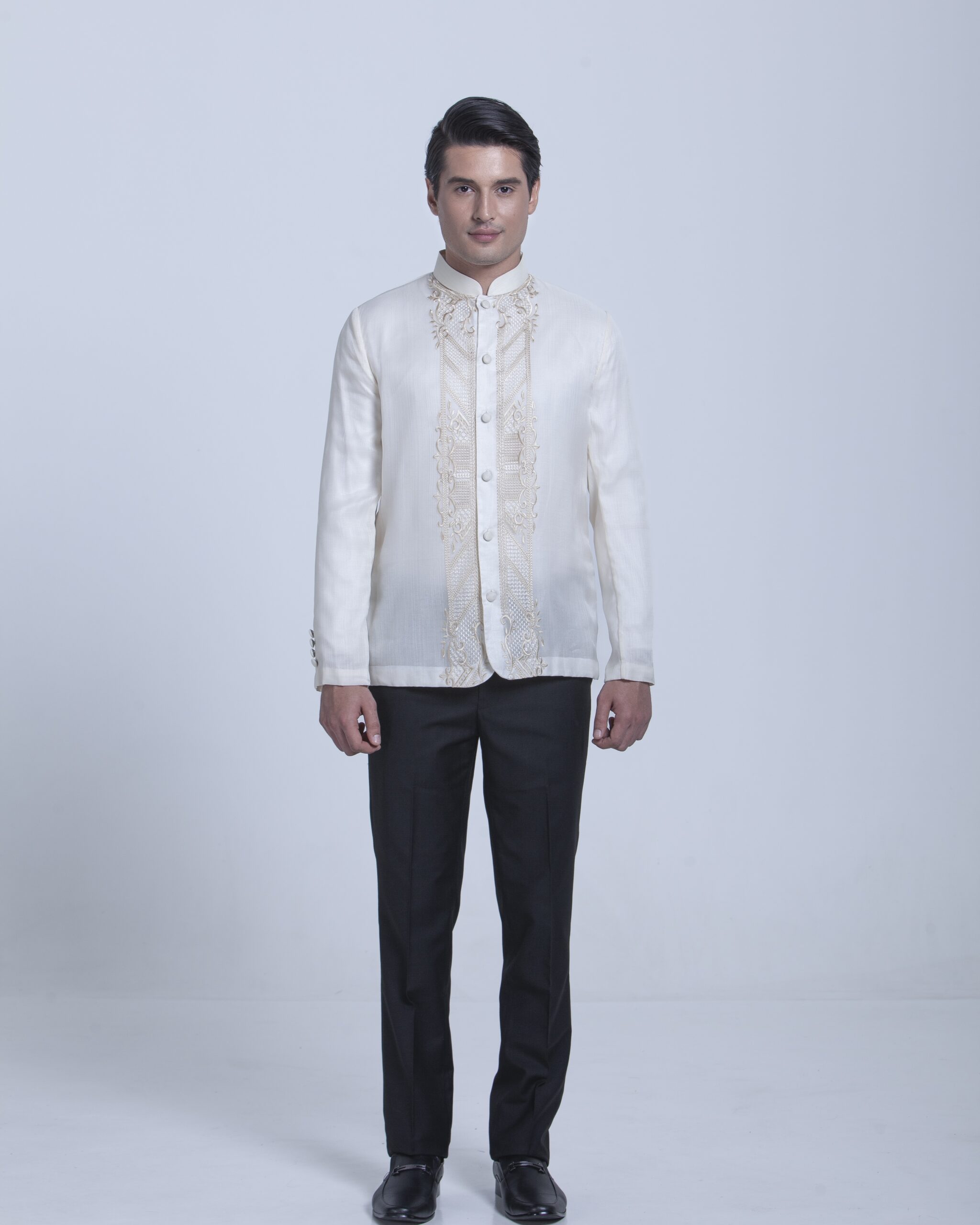 This Onesimus exquisitely tailored Formal Barong stands out with Coat-style sleeves and body fit. It has elegant traditional embroidery and handcrafted covered buttons.