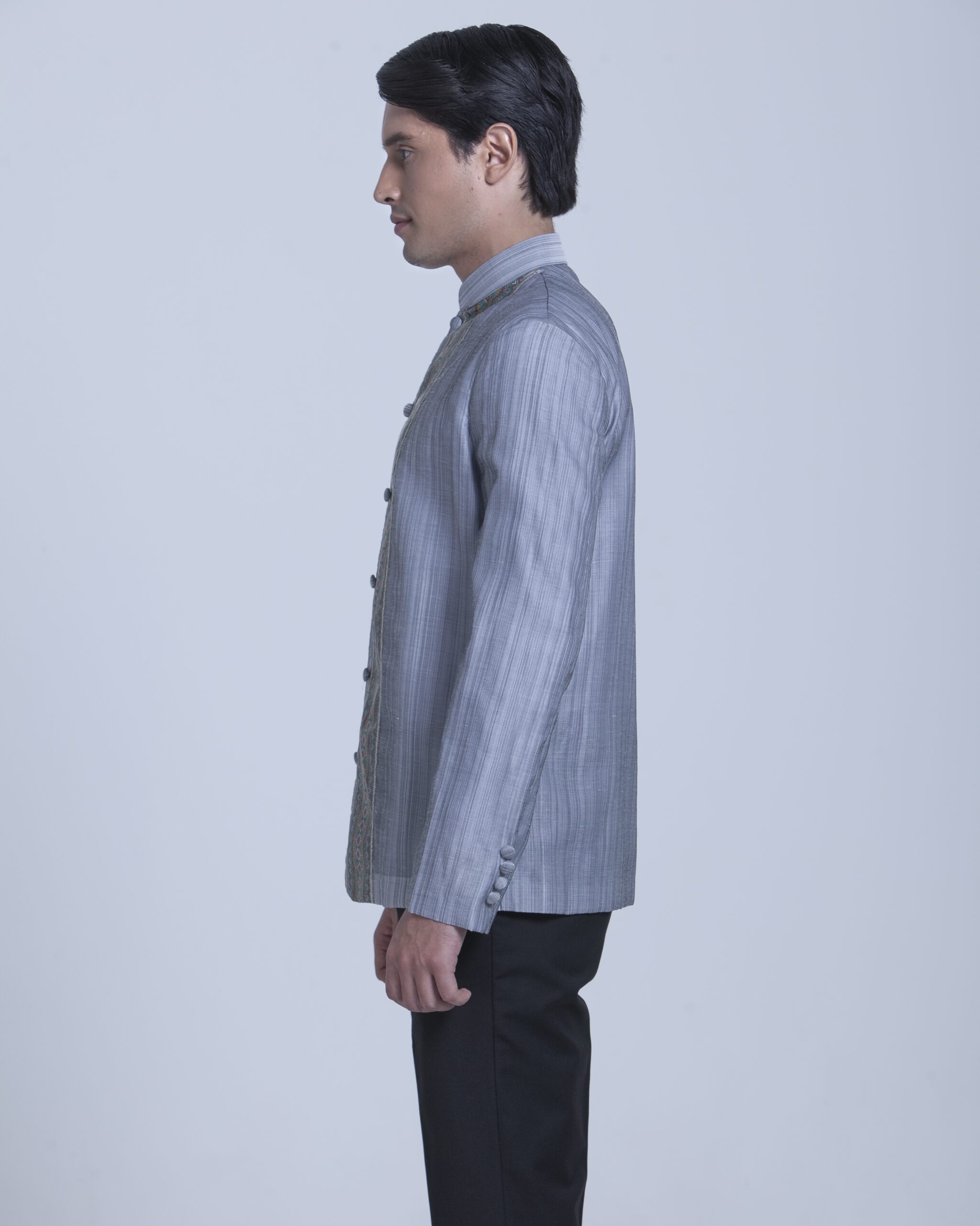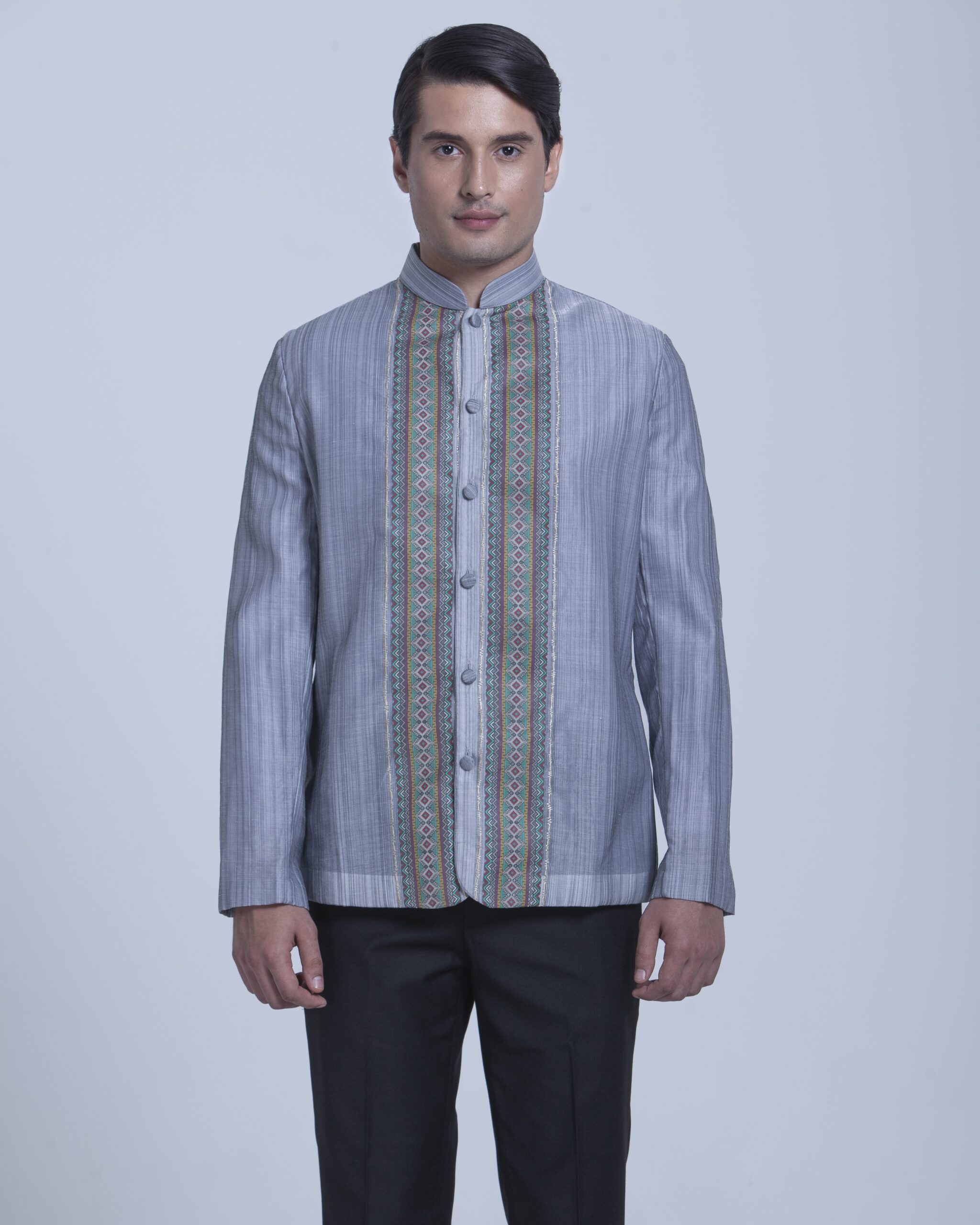 This Onesimus exquisitely tailored Formal Barong stands out with Coat-style sleeves and body fit. It has elegant Yakan pattern print and handcrafted covered buttons.